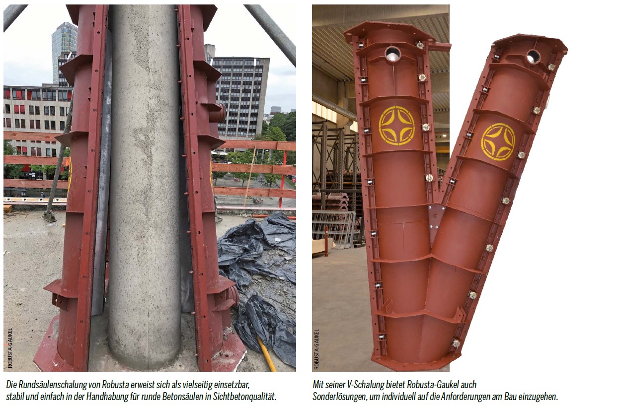 Auf dem Gebiet der Montage-, Anker- und Sicherheitstechnik sowie im Bereich Schalungen ist Robusta-Gaukel bereits seit 1965 am Markt vertreten. Mit Hauptsitz im Baden-Württembergischen Hausen setzt das Unternehmen »von der Idee, der Planung, der Konstruktion, der Fertigung bis zur Lieferung« auf »alles aus einer Hand«. Entwickeln konnte sich Robusta-Gaukel von einer Bauschlosserei zu einem innovativen mittelständischen Unternehmen, das mit Neuentwicklungen wie der ersten zug- und druckfesten Schrägstütze, dem Robusta-Ankersystem, der Sicherheitstechnik sowie zahlreichen Produkten für den Betonbau und die Betonfertigteilindustrie einen Namen gemacht hat. Im Bereich der Schalung sind vor allem Lösungen wie die Rundsäulen- sowie Sonderschalungen zu nennen: Die Rundsäulenschalungen sind für Betonsäulen in Sichtbetonqualität entwickelt worden, die von 250 mm bis 1 200 mm Durchmesser reichen und einem Betondruck von maximal 120 kN/m2 standhalten. Mittels Zentrierstiften ist ein passgenaues Zusammenfügen der beiden Schalungshälften geboten. Zurückgreifen kann Robusta-Gaukel überdies auf einen großen Erfahrungsschatz im Bereich der Sonderschalungen: Diese produziert der Hersteller auf Anfrage und projektbezogen – in jeglichen Sonderformen, individuell auf die jeweiligen Einsatzbedingungen zugeschnitten. Gedacht sind diese etwa zum Betonieren von Betonkörpern auf der Baustelle und im Fertigteilwerk in Sichtbetonqualität. Realisieren lassen sich die Sonderschalungen als Einzelstücke sowie in Kombination mit Standard-, Wand- und Deckenschalungen. Der Vorteil hier: Die Planung und Herstellung der Schalungskonstruktion erfolgt aus einer Hand. Zudem verweist Robusta-Gaukel hier auf eine »atmende Schalung« für fugenlose Betonteile. Im Portfolio hat das Unternehmen darüber hinaus auch Schalkörper für Aussparungen, etwa Hüllwellrohre für die rationelle Herstellung von Aussparungen, sowie Trapez- und Wellköcher für Köcher- und Blockfundamente.