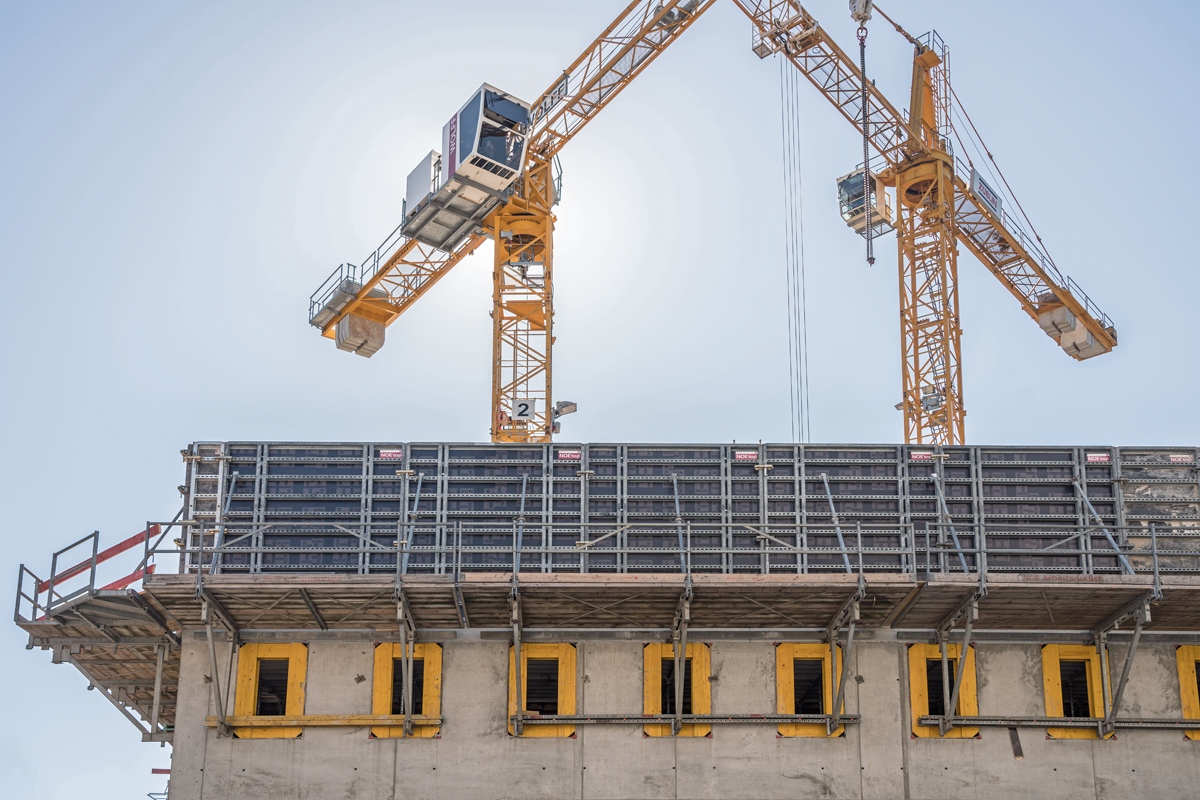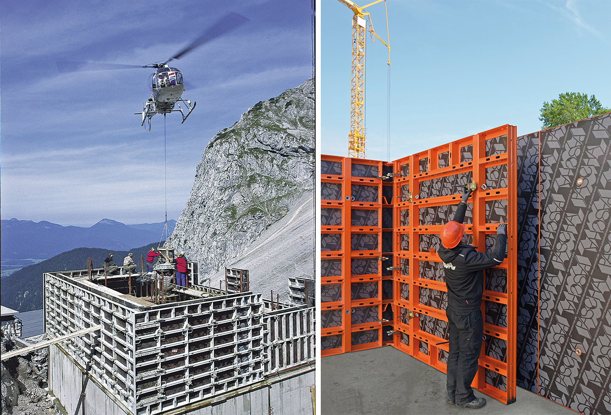 (links:) Hoch hinaus – und das mit Paschal im wahrsten Sinne: Schalungslösungen des Herstellers kommen weltweit im Rahmen spannender Bauprojekte zum Einsatz. (rechts:) Großflächige Wände gelingen mit den Großflächenschalungen »LOGO.pro« mit einseitig bedienbarer Ankertechnik sowie der »LOGO.3«-Wandschalung.
