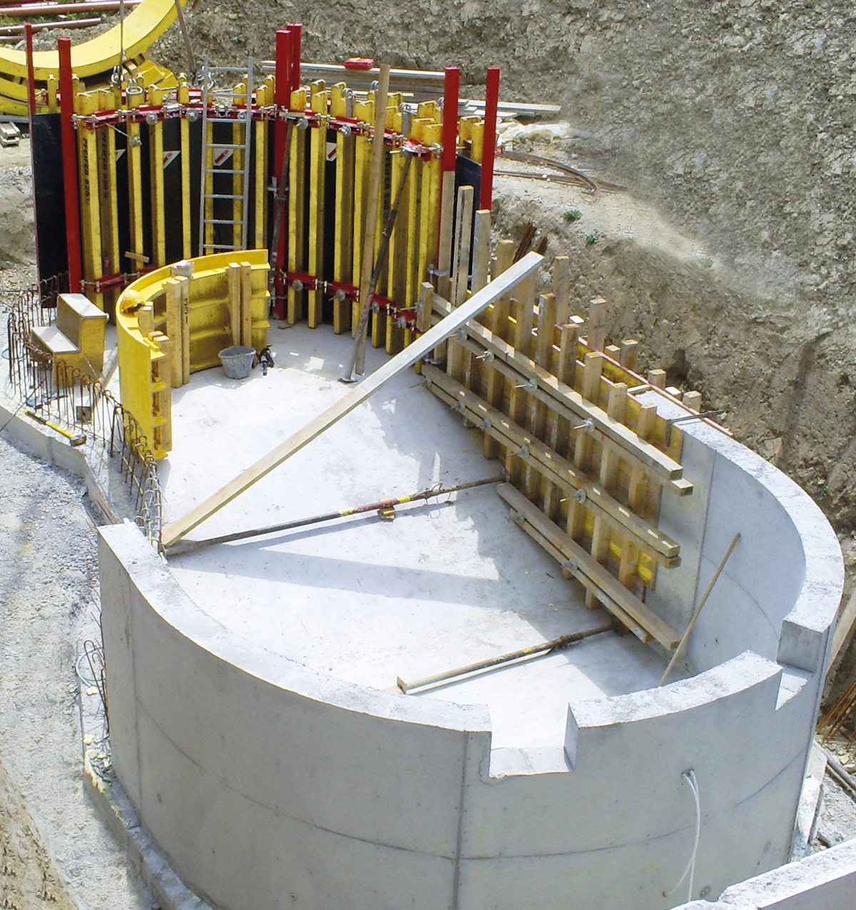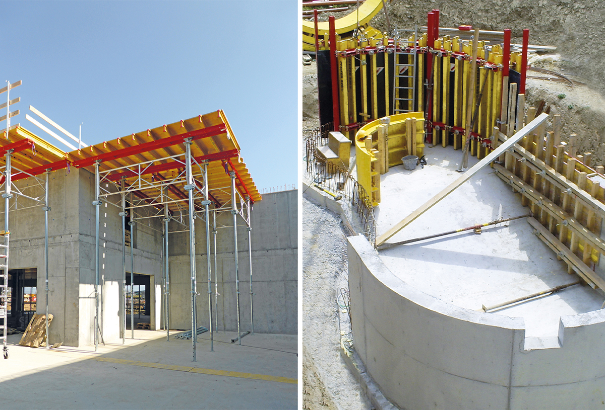 (links:) Um Decken schnell händisch von unten zu schalen, eignet sich das Tobler Deck Schalungssystem optimal. (rechts:) Mit Tobler Roundex lassen sich Wände mit wechselnden Radien wirtschaftlich schalen.