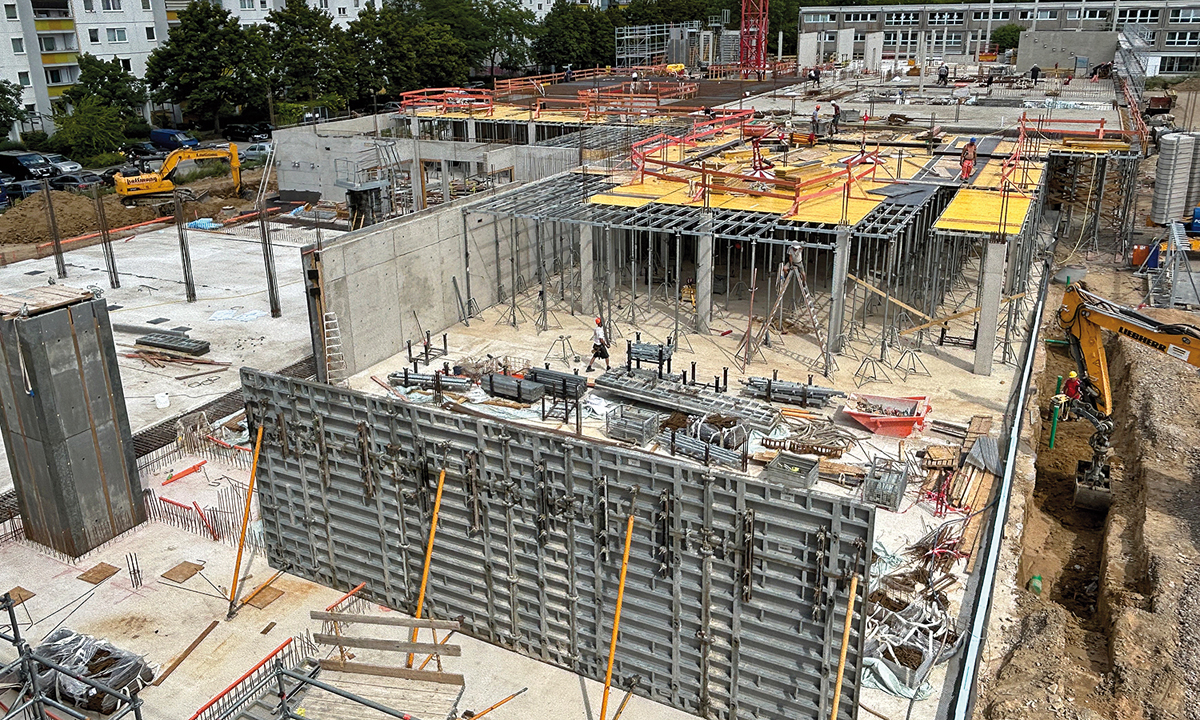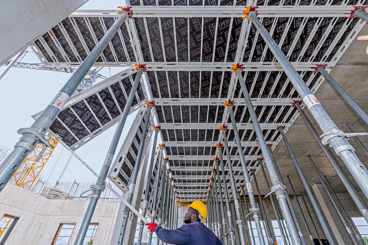 Bei den Deckenschalungen setzt Peri unter anderem auf »Skymax«-Großpaneele: Diese Schalung lässt sich sicher von unten für die Decke einsetzen. Damit können Deckenstärken von 40 bis 55 cm mit Mittelunterstützung hergestellt werden.
