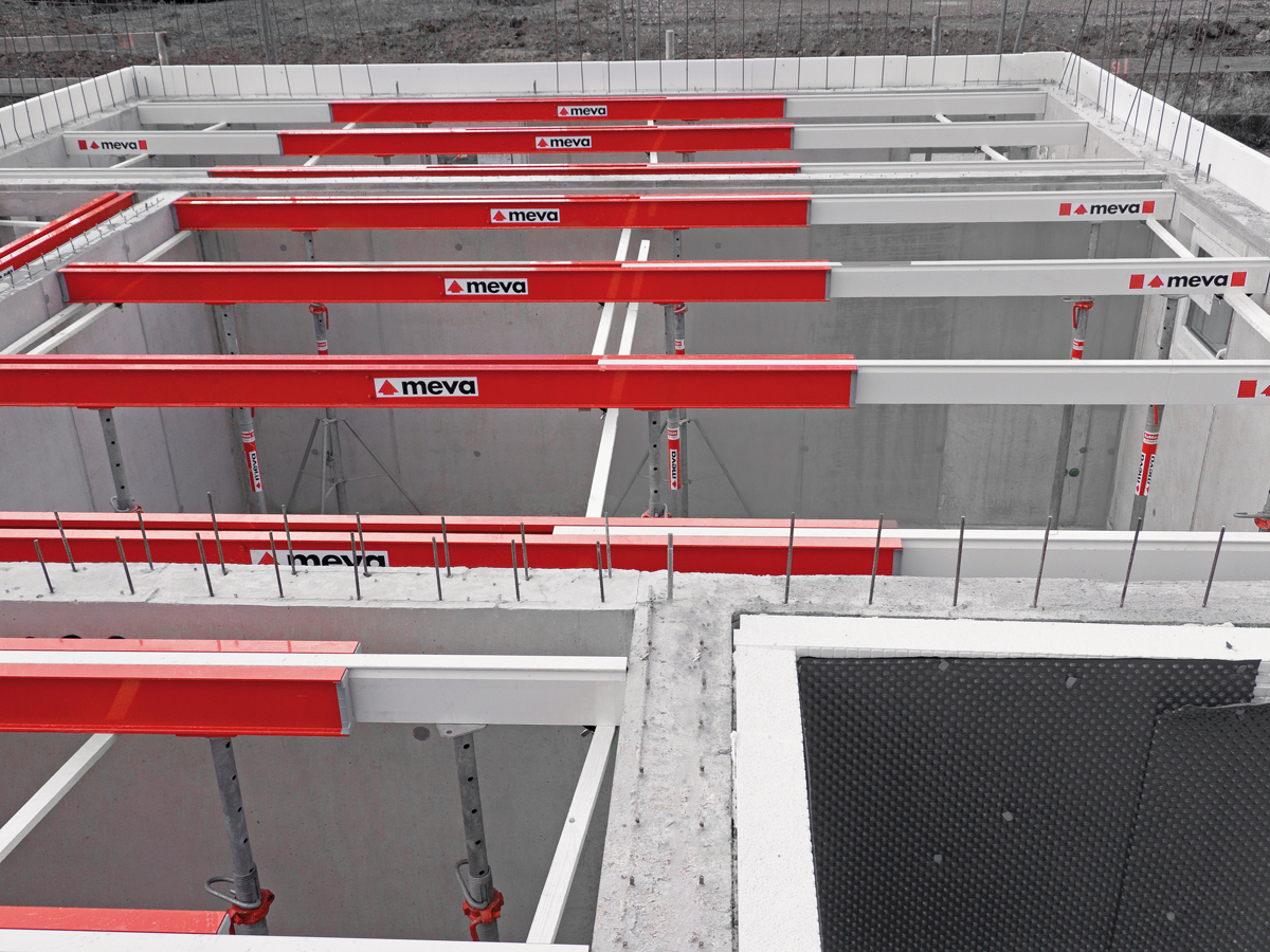 Durch die Kombi-Ankerstelle, so Meva, kann mit einem Handgriff zwischen drei Ankermethoden gewählt werden. Jedes Element kann sowohl als Stell- wie auch Schließschalung ohne zusätzliche Montage eingesetzt werden. Auf diese Weise möchte Meva kostbare Zeit einsparen und die Logistik vereinfachen. Zudem lassen sich die einzelnen Elemente aufgrund der bündig integrierten Kombi-Ankerstelle gut stapeln, ohne dass vorher Teile entfernt werden müssen. Im Repertoire hat Meva allerdings auch »Mammut XT« und damit eine Wandschalungseinheit für modulares Bauen im Großformat. Es wurde entwickelt, um eine flexible und einfach zu handhabende Großflächenschalung zu ermöglichen. Auch hier finden sich die Kombi-Ankerstellen, die flächenbündig integriert sind und somit das Stapeln von Schalelementen ermöglichen. An dieser Stelle weist Meva auf die Verwendbarkeit der von alkus angebotenen Vollkunststoff-Platten hin, die deutliche Vorteile gegenüber klassischer Sperrholzplatten aufbieten. Mit »Mammut XT« lässt sich eine Schalfläche von bis zu 8,7 m2 pro Element realisieren – die Abmessungen betragen 350x250 cm. Im Bereich der Deckenschalung bietet Meva hingegen »MevaDec« und »VarioMax« auf: Letztere ist ein flexibles, leichtes und aus wenigen Teilen zusammengesetztes Trägersystem, das für den Bau von Fertigteildecken eingesetzt wird. Zu nennen ist überdies »MevaDec«: Die Deckenschalung ist so konzipiert, dass verschiedene Deckenschalungsmethoden mit einem einzigen System möglich sind. Unabhängig davon, welche Schalungsmethode, ob nun FTE, HN oder E-Methode, für das jeweilige Bauprojekt notwendig ist, werden immer die gleichen Komponenten verwendet.
