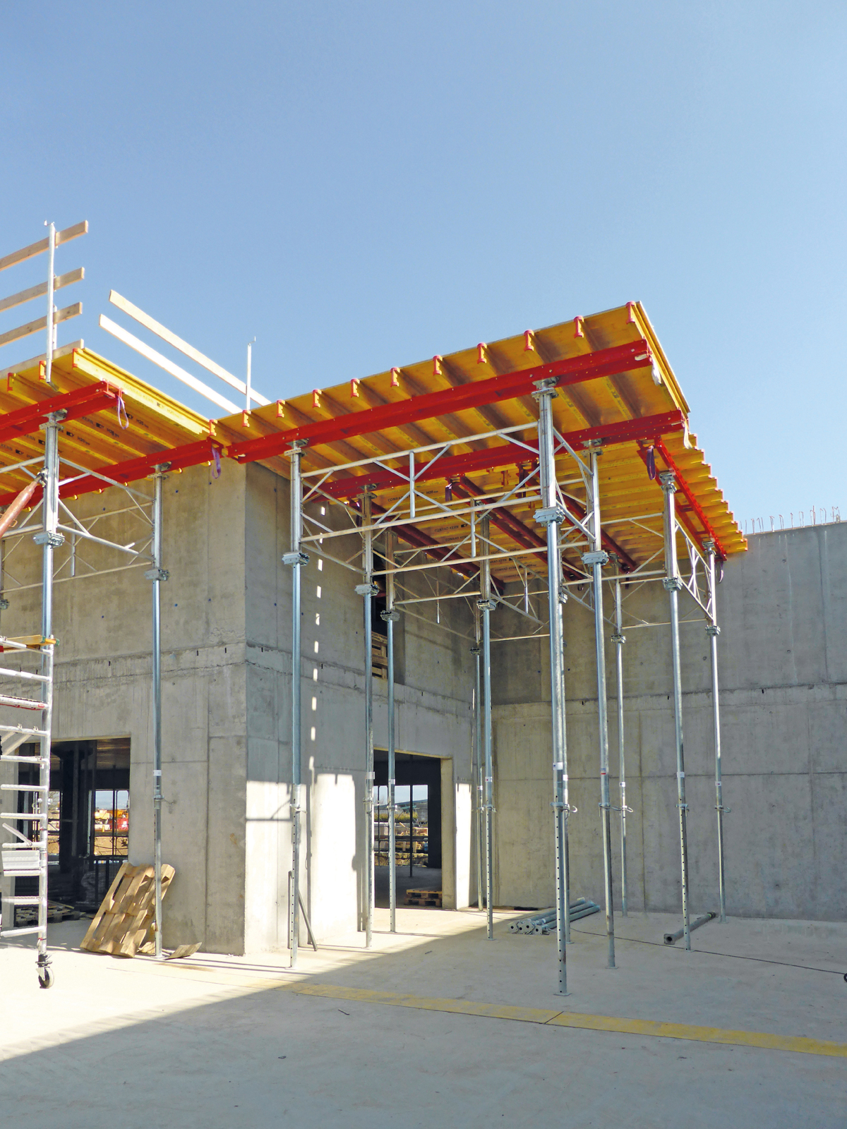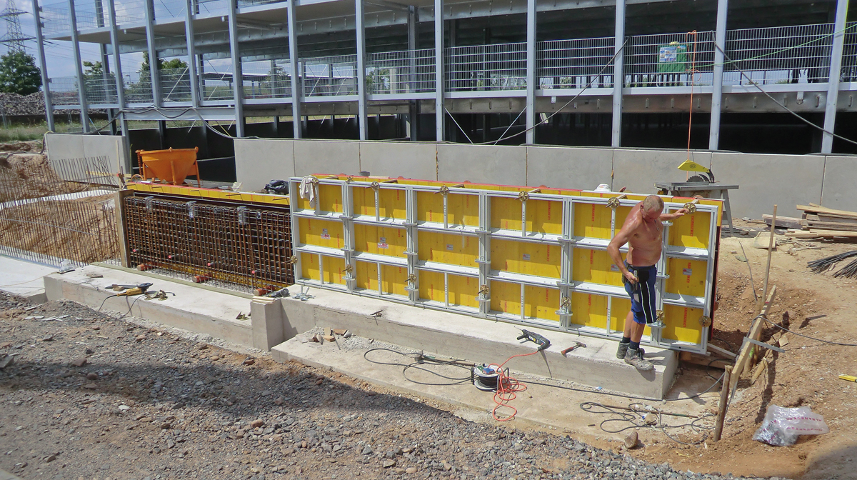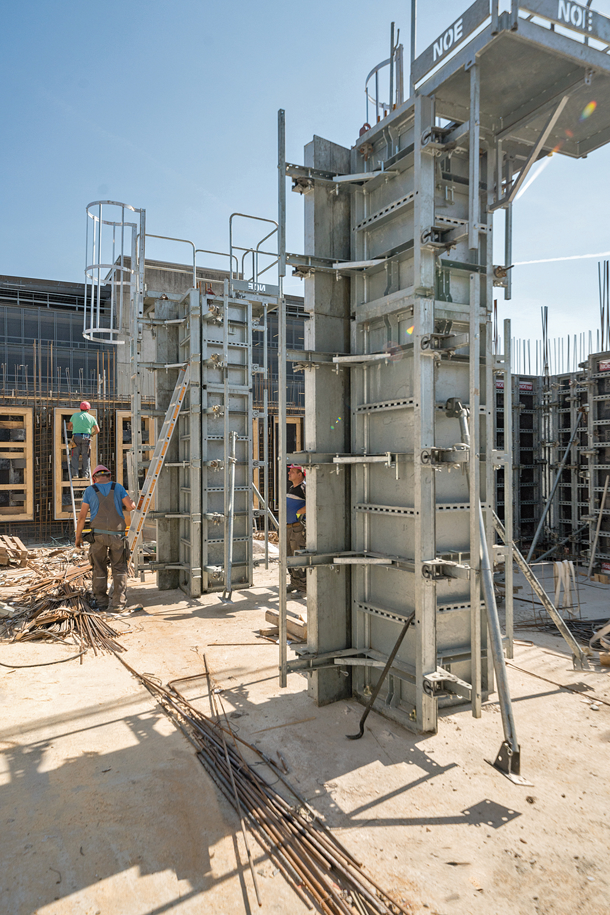 Die modulare Deckenschalung »Onadek« und die Großflächen-Stahlrahmenschalung »Batek« im Einsatz: Letztere vereint drei Ankervarianten in einem System. Dabei besteht die Möglichkeit des einseitigen Ankerns mit konischem Spannsystem oder mit konventionellen Ankerstäben. Hinzu kommt als dritte Option die klassische beidseitige Ankerung mit Standard-Ankerstäben.