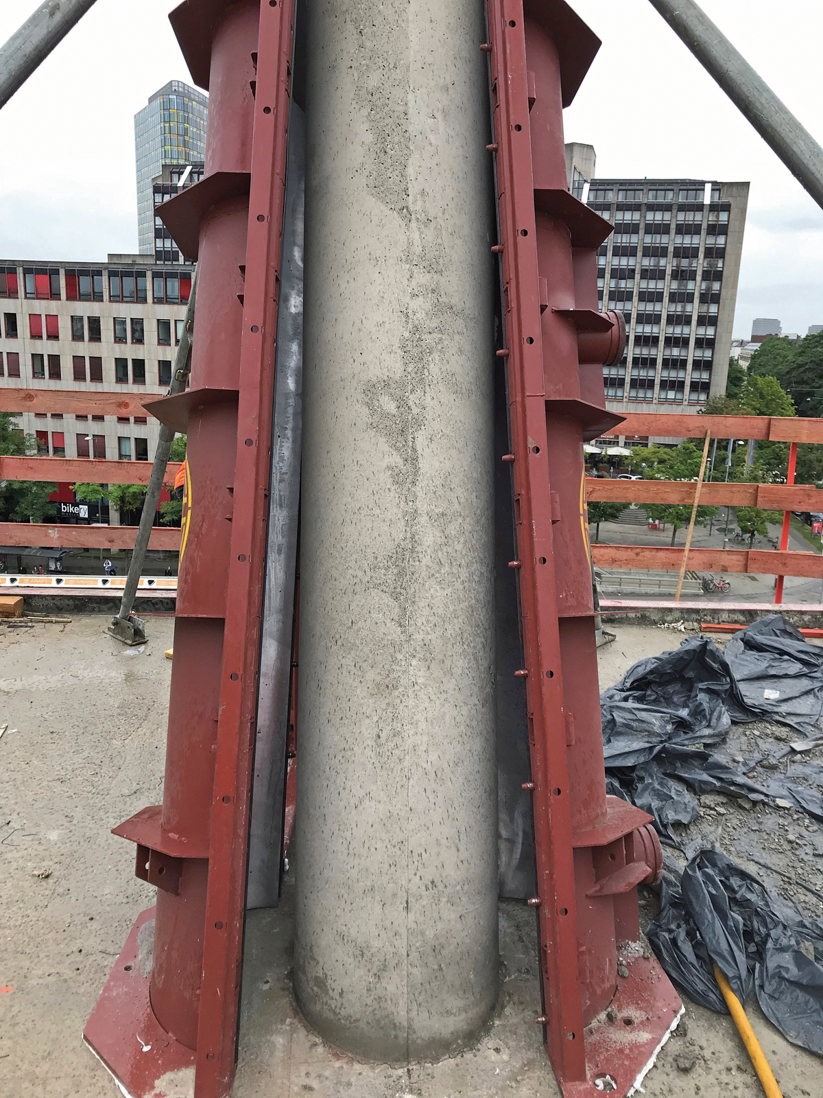 Großflächige Wände gelingen mit den Großflächenschalungen »LOGO.pro« mit einseitig bedienbarer Ankertechnik sowie der »LOGO.3«-Wandschalung, kranlose Baustellen benötigen die leichte »NeoR« oder »LOGO.alu«. Eine ähnliche Vielseitigkeit zeigt sich auch im Bereich der Stützenschalung. Zu nennen ist hier etwa die verstellbare Variante »Grip«. Damit, so der Hersteller, lassen sich »hervorragende Schalzeiten bei hohen Sichtbetonanforderungen« erzielen. Die Stützenschalungselemente können nach dem Windmühlenflügelprinzip in 5-cm-Schritten ohne Wechsel der Schalhaut verstellt werden. Der integrierte Klappmechanismus ermöglicht zudem einen zeitsparenden Auf- sowie Abbau. Für runde und ovale Stützen kommt hingegen die Rundstützenschalung zum Einsatz. Diese besteht aus zwei baugleichen Halbschalen aus Stahl, welche laut Paschal hohe Einsatzzahlen gewährleisten sollen. Durch Verbindungselemente zur Universalschalung »Raster / GE« lassen sich im Übrigen auch halbrunde Wandabschlüsse herstellen. Die ebenfalls im Programm vorhandene, verstellbare »Raster-Stützenschalung« eignet sich wiederum für rechteckige und quadratische Stützenquerschnitte mit 20 bis 50 cm Außenabmessung im 5-cm-Raster. Last but not least bietet Paschal hohe Kompatibilität, denn, auch die Multielemente der »LOGO.3«-Wandschalung oder die Standard-Elemente der Universalschalung »Raster / GE« kombiniert mit Außenecken lassen sich zum Einschalen von eckigen Stützen verwenden.
