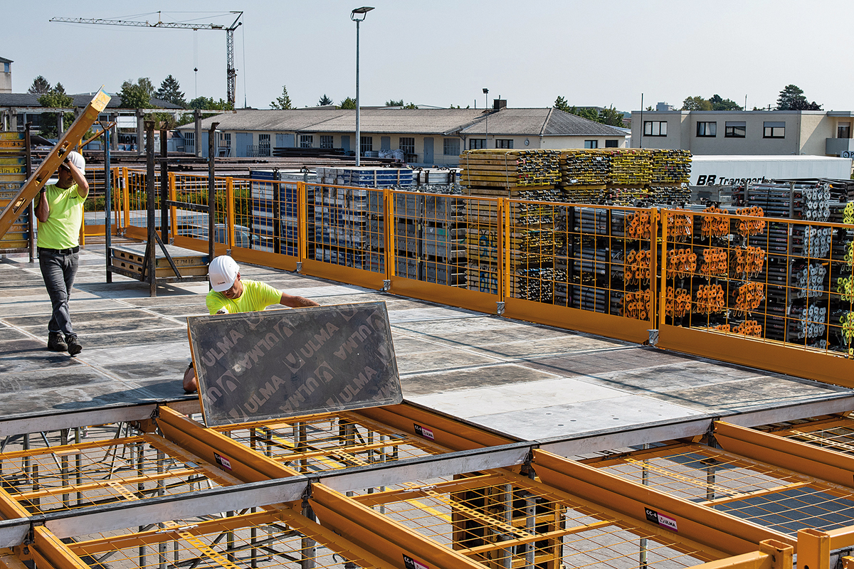 gebot von Ulma Construction erstreckt sich von Verkauf und Vermietung von Betonschalungs- und Gerüstsystemen über die technische Planung und Beratung bis hin zur Montage, Schalungsbau und der Baustellenbetreuung. Das Portfolio reicht von Wand- und Deckenschalung über Kletterschalungen, Stützen und Traggerüste bis Schalplatten, Holzträger und Arbeitssicherheitslösungen. Auch hier würde die schiere Auflistung aller Ulma-Lösungen den redaktionellen Rahmen sprengen, weshalb gerade die Kernprodukte in den Mittelpunkt gestellt werden. Hierzu zählt etwa das Deckenschalung-Trägersystem »Onadek«, das aus feuerverzinkten Stahlprofilen gefertigt ist, die bewusst dünnwandig und hochfest konstruiert wurden, um eine möglichst hohe Leistungsfähigkeit zu erzielen. Das modular aufgebaute System hat ein geringes Gewicht und lässt sich deshalb gut auf- und abbauen sowie zum Einsatzort transportieren. Das »Onadek«-System wurde als Deckenschalungslösung für Ortbeton entwickelt und erweist sich in der Praxis als extrem schnell, langlebig und flexibel. Geeignet ist es gerade im Wohnungs- und Geschossbau für alle Arten von Decken – auch jene mit unregelmäßigem Grundriss, Unterzügen oder Passbereichen. Durch das verwendete Fallkopfsystem können alle Träger und Schaltafeln für den nächsten Einsatz wiedergewonnen werden – nur die Stützen und Schnellabsenkköpfe verbleiben als Notunterstützung. Ein weiteres Highlight im Ulma-Sortiment dürfte die Moduldeckenschalung »CC-4 Protect« darstellen.