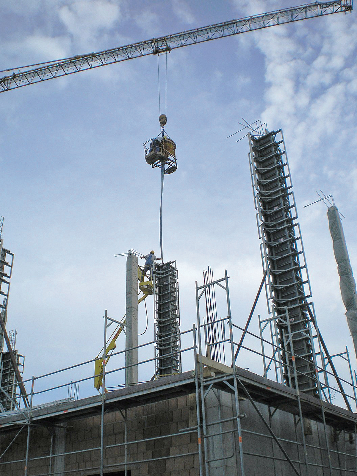 Durch die mittige Anordnung der Ankerstellen, so Peri, wird die Anzahl der benötigten Anker im Vergleich zu Schalungssystemen mit beidseitiger Ankertechnik um bis zu 40 % reduziert. Mit dem einhändig bedienbaren Richtschloss BFD sind sämtliche Elementverbindungen bündig, fluchtend und dicht im Ergebnis. In der »Maximo«–Serie finden sich außerdem Lösungen wie das MXK Konsolensystem, eine händisch montierbare Arbeitsbühne für Schalungsarbeiten sowie die MXP Plattform, eine mit dem Kran ansetzbare Arbeitsbühnenlösung für großformatige Wandschalungseinheiten. Peri differenziert im Bereich Säulenschalungen zwischen rechteckigen Säulen (Quattro, Rapid, Trio, Vario GT 24, Duo) und runden Säulen (SRS). Alle Säulenschalungen sind kranbar, wobei die Quattro Säulenschalung als einzige Schalung auch von Hand versetzt werden kann. Die komplette Säule kann hierbei samt Richtstützen und Betonierbühne mit nur einem Kranhub umgesetzt werden. Geht es wiederum um Deckenschalungen setzt Peri unter anderem auf »Skymax«-Großpaneele: Diese Schalung lässt sich sicher von unten für die Decke einsetzen. Damit können Deckenstärken von 40 cm bis 55 cm mit Mittelunterstützung hergestellt werden. Im Repertoire hat Peri allerdings auch die leichte Universalschalung »Duo« sowie die Skydeck Paneel-Deckenschalung für Decken in höherer Lage, die Multiflex Träger-Deckenschalung für Decken mit komplexer Formgebung und die Variodeck Stahlriegel-Deckentische für besonders große Schalflächen und Fertigteile. Im Portfolio von Peri finden sich darüber hinaus aber auch zahlreiche Traggerüste und Stützen, Arbeitsgerüste und Treppen sowie Klettersysteme und ein umfangreiches Sortiment an Schalungsplatten. Alles in allem kann sich Peri aufgrund seiner Produktvielfalt im Bereich Schalung und der beständigen Nähe zu den hauseigenen Gerüstlösungen als vollumfänglicher Systemanbieter betrachten. Seien es Fundament-, Wand-, Säulen-, Deckenschalungen sowie Ingenieurbaulösungen für Brücken, Tunnel und Hochhausbau oder gar Sonderschalungen – genau hier kann der Hersteller mit Vielseitigkeit punkten und dem Anwender die komplette Bandbreite im System anbieten.