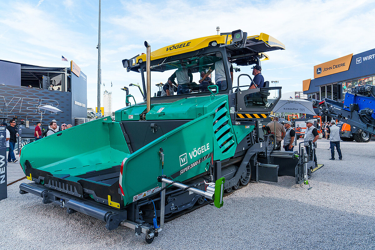 Vögele präsentierte erstmals in den USA die neue Strich-5-Fertigergeneration. Im Fokus standen die Weltpremieren der 10-ft-Klasse: der Raupenfertiger Supeer 2000-5 X und die Radversion Super 2003-5 X mit den neu konzipierten Bohlen VR 600 und VF 600. Die Strich-5-Generation zeichnet sich durch einen hohen Bedienkomfort, automatisierte Prozesse, kürzere Rüstzeiten sowie geringe Schall- und Abgasemissionen aus. Aus der Mini Class war ebenfalls ein Strich-5-Vertreter vor Ort: der neue Super 800-5 P. Mit neuer Behälterwandgeometrie und neu konzipiertem Bedienstand bietet er eine optimale Übersicht und Ergonomie. Auf großes Interesse stieß außerdem die neue Bohle VR 500 für die 8-ft-Klasse, hier in Kombination mit dem Super 1700-3.