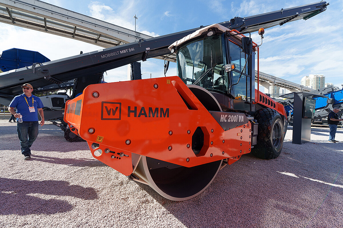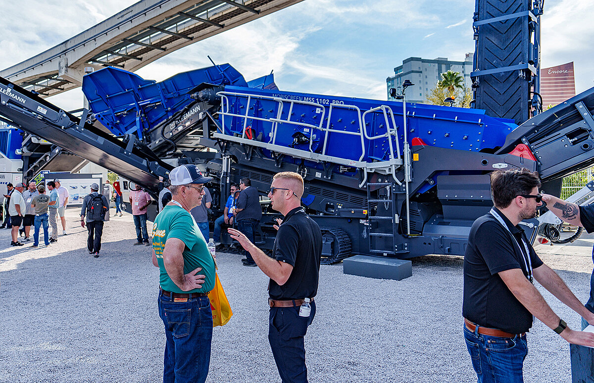Bei Hamm stand die automatisierte Verdichtung im Mittelpunkt und damit das System Smart Compact Pro. Dabei ermittelt der neue Sensor „Realtime Density Scan“ an der Maschine die Asphalt-Dichte in Echtzeit, um Verdichtungsenergie und -modi in beiden Bandagen automatisiert und getrennt voneinander zu regeln. Die Echtzeit-Dichte ist die zentrale Kenngröße für die qualitative Beurteilung während der Verdichtung und ist bei Smart Compact Pro zum ersten Mal in den Verdichtungsprozess integriert. Für den Erdbau zeigte Hamm mit dem Walzenzug HC 200i C VA eine weitere innovative Lösung. Smart Compact ermöglicht hier auf Basis einer neuen Verdichtungsmessung und einer variablen Amplitude die automatisierte Verdichtung auf einen vorgewählten Zielwert in MN/m (MPa). Mit der HC 100i G präsentierte Hamm zudem ein neues Modell speziell für die Maschinenvermietung. Eine Marktpremiere führte auch bei Kleemann das Aufgebot an Maschinen an. Mit der Mobiscreen MSS 1102 PRO ist ab sofort die erste Grobstücksiebanlage der PRO-Line auf dem nordamerikanischen Markt verfügbar. Die robuste Anlage ist für Leistungen bis zu 827 US t/h (750 t/h) ausgelegt und ideal für den Einsatz im Steinbruch geeignet. Hohe Durchsatzleistungen, flexible Konfigurationsmöglichkeiten und die intuitive Anlagensteuerung sorgen für Produktivität und Sicherheit. Mit Spective Connect erhalten Bediener alle relevanten Prozessdaten direkt auf das Smartphone oder Tablet. Mithilfe der Haldenüberwachung kann der aktuelle Stand von Materialhalden angezeigt werden. Beim Erreichen eines bestimmten vordefinierten Werts erscheint ein Hinweis, dass die Halde zeitnah abgeräumt werden soll. Dadurch wird die Arbeit erleichtert und die Produktivität erhöht.