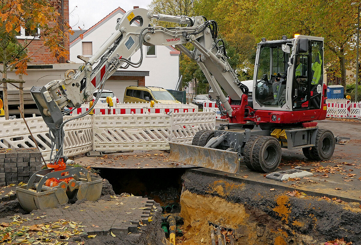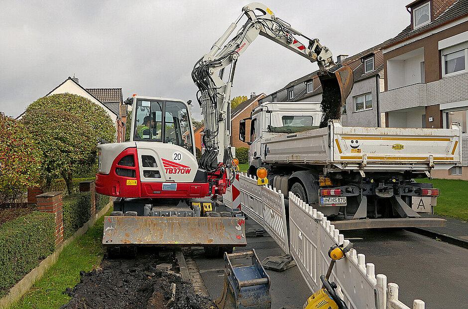 Oleg Heinz, Betriebsleiter der SL Infrastrukturbau aus Lünen, sagt: »Schnell müssen sie sein, standfest und genau arbeiten können.« Die Firma ist Teil der Stadtwerke Lünen und vornehmlich für den Bau sowie die Unterhaltung des Leitungsnetzes zuständig. Für die Mobilbagger bedeutet dies häufige Ortswechsel auf eigener Achse und sehr genaues Arbeiten in und an den Leitungsgräben und -schächten. Aktuell müssen sie in Lünen in verschiedenen Straßen mehrere Kilometer Leitungsgräben ausheben. Eine wichtige Voraussetzung ist Standfestigkeit. Der niedrige Schwerpunkt der »TB 370 W« und Achtfach-Bereifung sind die sichere Basis. Das grundsolide Planierschild sorgt für noch mehr Bodenhaftung. »Wir haben zusätzlich Abstützpratzen montieren lassen. Das bringt Sicherheit auch in sehr anspruchsvollen Bausituationen«, beschreibt Heinz.