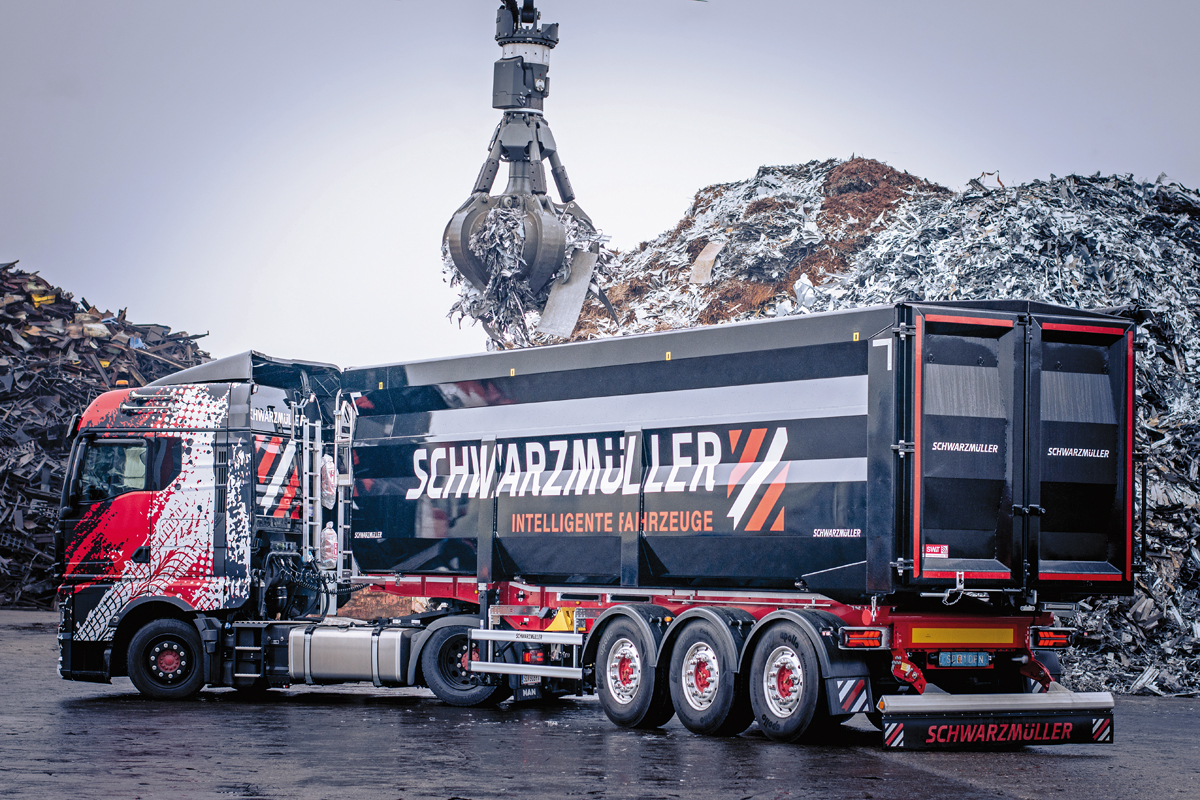 Die neu konzipierte 3-Achs Stahl-Kastenmulde von Schwarzmüller ist speziell für die Entsorgungsbranche entwickelt und hat ein Fassungsvermögen von 52 m³ bei einer Länge von zehn Metern. Darüber hinaus ist ebenso eine 60 m³ Ausführung bei 11,5 m erhältlich. Sie lässt sich bis zu einem Kippwinkel von 46° aufkippen. Die Mulde in gewichtsoptimierter Leichtbauweise hat waagrecht profilierte Wände und im oberen Bereich einen Stabilisierungsrahmen. Die durchgängige Kippwelle und deren minimaler Abstand zur Hinterachse tragen wesentlich zur maximalen Kippstabilität bei. Die Rückwand besteht aus einer Doppeltür, welche durch einen Drehstangenverschluss verriegelt und betätigt wird. Zum sicheren Be- und Entladevorgang ist zusätzlich eine pneumatische Sicherungsverriegelung verbaut, welche seitlich am Auflieger betätigt wird. Eine Rollplane inklusive abnehm- bzw. umschwenkbaren Rohrquerverbindungen, LED-Beleuchtung, ein Stehpodest sowie eine erhöhte Kupplungshalterung runden dieses Fahrzeug ab.j