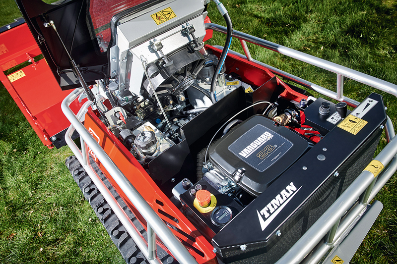 Die Timan-Mähraupe RC-751 ist dauerhaft mit einem Schlegelmulcher mit 32 Y-Schlegeln ausgestattet. Der Mähkopf ist vorn vor den Raupenbändern platziert, sodass man leicht an einer Mauer oder einem Zaun längs mähen kann. Der Motor von Briggs & Stratton verfügt über 14 PS. Die Raupe hat ein Eigengewicht von 345 kg und lediglich eine Gesamthöhe von 60 cm.