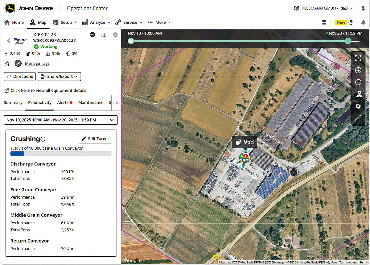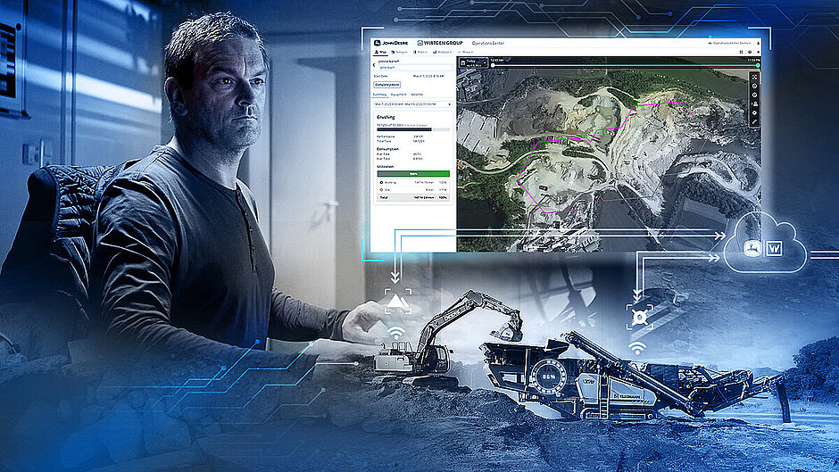 Mit WPT Crushing ausgestattete Maschinen und das John Deere Operations Center funktionieren optimal im Team. Die wichtigsten Funktionen der digitalen Telematikplattform umfassen die Planung, Überwachung, Wartung und Analyse von Baustellen und Maschinen. Durch die integrierten Wartungspläne und datenbasierte Handlungsempfehlungen wird eine umfassende Prozess-, Maschinen- und Serviceoptimierung ermöglicht. Der Zugriff auf die Plattform ist sowohl über das Web als auch über mobile Geräte jederzeit und überall möglich.