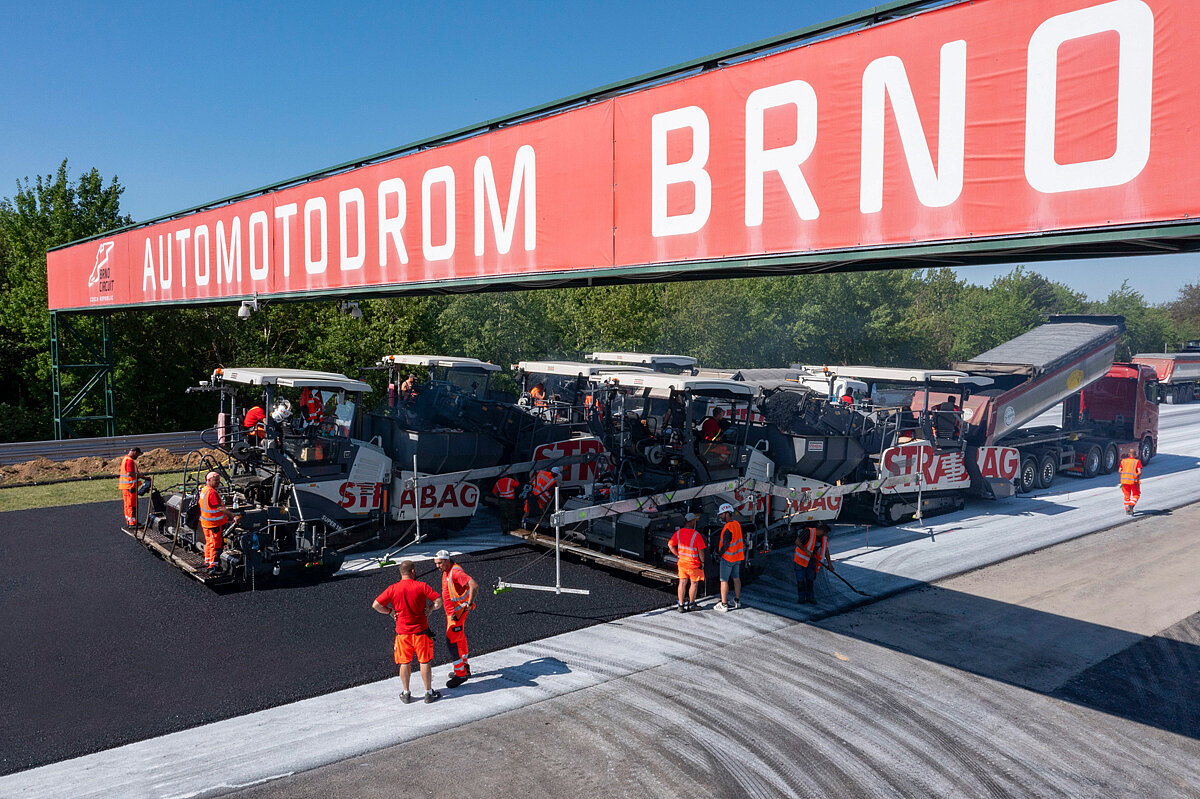 An internationale Rennstrecken werden besonders hohe Anforderungen in Bezug auf Ebenheit, Griffigkeit, Texturhomogenität und andere Faktoren gestellt: Es geht um maximalen Grip und durchgängige Ebenheit – und damit auch um die Sicherheit der Fahrer. Die Sanierung der Rennstrecke in Brünn umfasste die komplette Fahrbahn des 5,4 km langen Masaryk-Rings: Über die Breite von 15 m bis 17 m bauten drei Vögele Fertiger vom Typ Super 1800-3i und drei Beschicker vom Typ MT 3000-2i Standard einen 2,5 cm starken Profilausgleich und eine 4 cm starke Deckschicht ein.