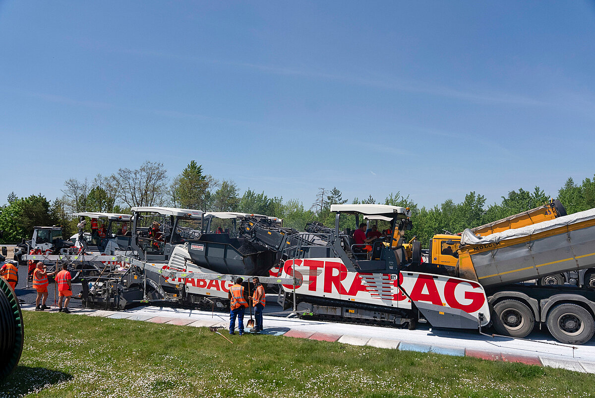 Der Einbau selbst erfolgte im Heiß-an-Heiß-Verfahren, um eine nahtlose Oberfläche zu erzielen. Durch die hohen Schubkräfte auf der Rennstrecke würden sich Nähte oder Fugen ansonsten nach kürzester Zeit öffnen. Die drei Straßenfertiger vom Typ Super 1800‑3i arbeiteten dabei Bahn an Bahn leicht versetzt nebeneinander – über die gesamte Fahrbahnbreite von 15 m bis 17 m. Der Heiß-an-Heiß-Einbau ermöglicht einen optimalen Verbund und eine wasserundurchlässige, stabile und langlebige Fahrbahnoberfläche.