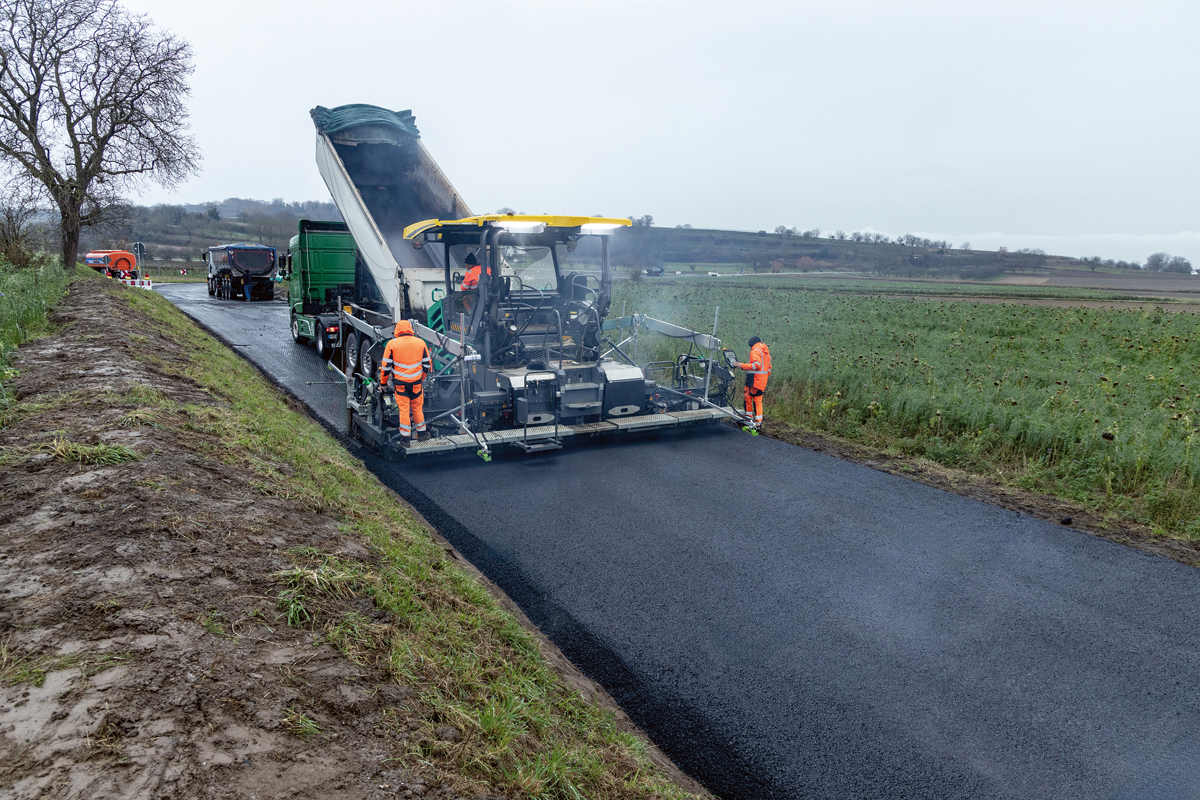 Das Team um Gutmann musste beim Einbau auf der L 106 auf höchstmögliche Ebenheit achten: Die alte Fahrbahn wies teils starke Schäden auf, weshalb in einigen Bereichen nicht nur eine 4 cm starke Deckschicht, sondern auch eine neue Binderschicht in variierender Stärke von 4 bis 14 cm eingebaut werden musste. Um die langgestreckten Bodenwellen auszugleichen, nutzte das Team zwei Big-MultiPlex-Ski. Das Sensorensystem von Vögele sei genau für solche Einsätze prädestiniert: An dem variablen 5 bis 13 m langen Träger befestigte das Einbauteam drei Ultraschall-Multi-Sensoren. Auf diese Weise tastete der Big-MultiPlex-Ski eine Referenz an mehreren auseinanderliegenden Punkten gleichzeitig ab. Aus den ermittelten Messwerten bildete die Nivellierautomatik Niveltronic Plus einen Mittelwert über den gesamten Messbereich hinweg und glich so auch langgestreckte Unebenheiten aus.