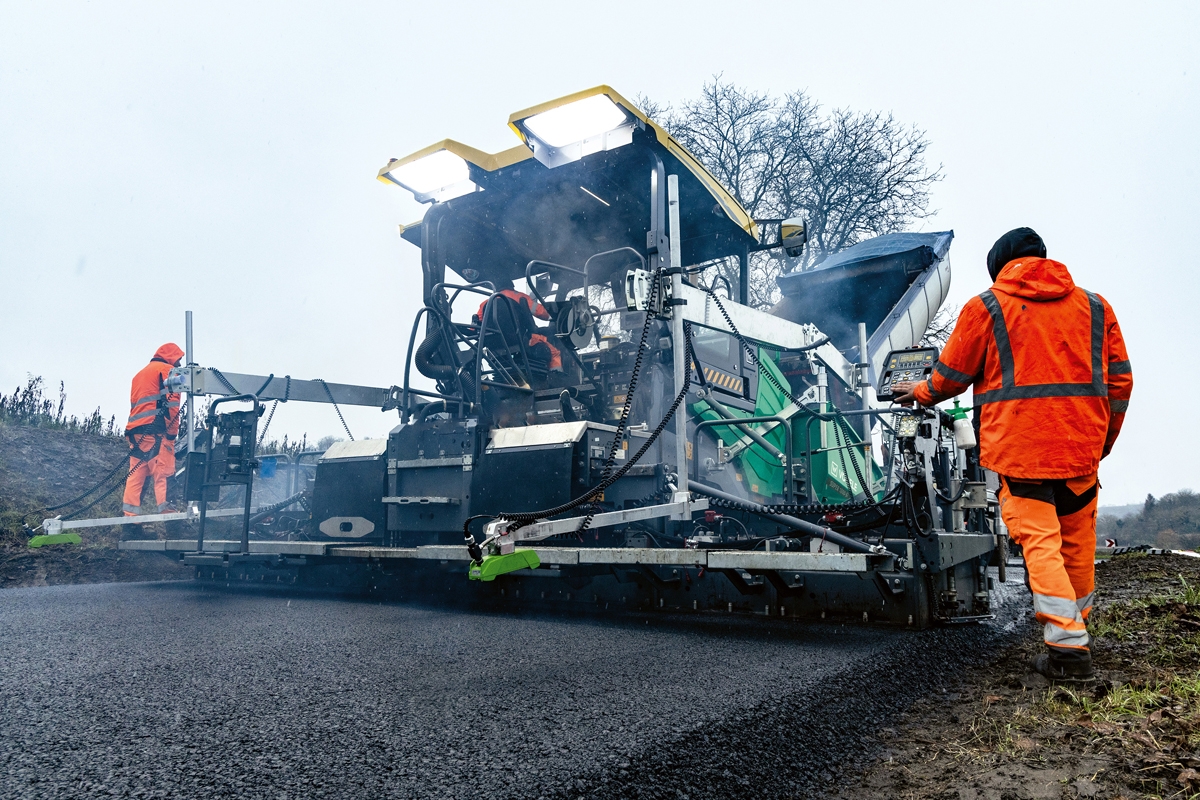 Die Wetterbedingungen waren insgesamt nicht ideal: Abgesehen von der Dunkelheit erschwerten Regen und Schnee den Einsatz. Gutmann und sein Team nutzten deshalb das neue Lichtpaket Plus: Die integrierte LED-Beleuchtung leuchtet Bedienplattform, Servicepunkte und Nivellierzylinder noch besser aus. Statt der Lichtballone sind leistungsstarke LED-Strahler fest in der Dachverlängerung intergiert und erhellen den gesamten Arbeitsbereich bis zu vier Meter hinter der Bohle und bis zu einer Einbaubreite von zehn Metern. „Damit konnten wir alle relevanten Arbeitsbereiche gut einsehen und uns den Transport und die Montage von zusätzlichen Leuchtmitteln sparen“, sagt Gutmann. „Das hat die Rüstzeiten auf der Baustelle deutlich reduziert.“