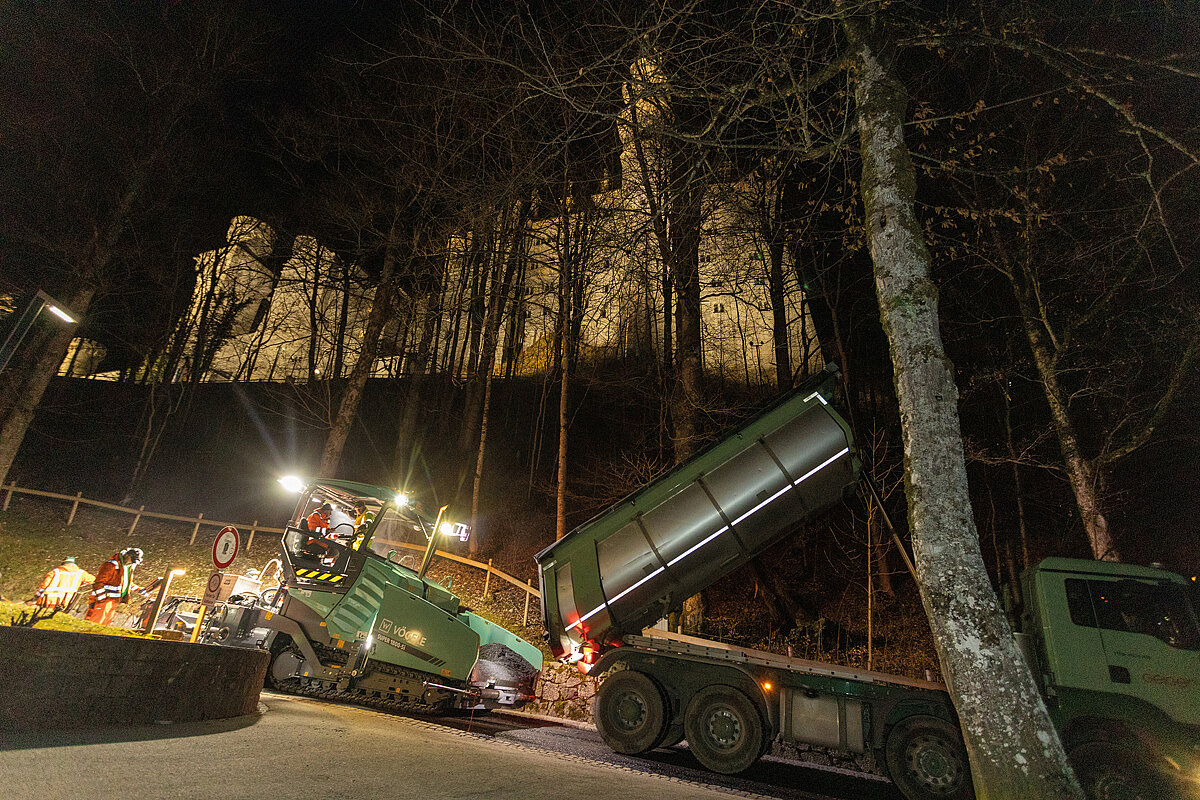 Schloss Neuschwanstein ist Unesco Weltkulturerbe und die wohl berühmteste Sehenswürdigkeit in Deutschland. Ein guter Teil der jährlich rund 1,4 Mio. Besucher bewältigt den Anstieg zum Schloss mit der Pferdekutsche. Denn außer Einsatz- und Unterhaltsfahrzeugen dürfen nur sie die steile, gewundene Straße befahren. Allerdings sind die eisenbeschlagenen Hufe der Pferde eine hohe Belastung für den Asphalt. Deshalb beauftragte die Bayerische Schlösserverwaltung die Erneuerung der Deckschicht auf der Gesamtlänge von 1,3 km.