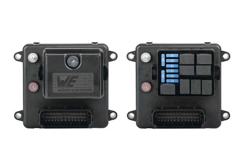 Um zu vermeiden, dass die Temperatur innerhalb der Box über 100 °C steigt, empfiehlt der Anbieter, eine Anwendungsbegrenzung und eine Systemwarnung über CAN-Kommunikation zu programmieren. Zur Temperaturmessung sind zwei Sensoren eingebaut. Über ein M6-Versorgungselement wird der Strom auf die Relais und die elektronischen Ausgänge des Moduls verteilt. Die CPU und die elektronischen Teile der Box werden von einem Pin des 39-poligen Leavyseal-Steckverbinders versorgt. Die Trennung in der Versorgung ermöglicht die getrennte Absicherung der Strom- und Logikleitungen.