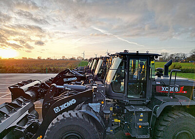 Und genau das bekamen bauMAGAZIN-Chefredakteur Dan Windhorst und Mediaberaterin Emilie Plath im Rahmen des Test-Events auch zu spüren. Eine Besonderheit stach gleich zu Beginn ins Auge: Die für die Tests zur Verfügung gestellten E-Radlader strahlten in einer hellgrünen Lackierung, weshalb sie liebevoll auch als »Green Mountains« betitelt wurden. Damit möchte XCMG seine Elektrifizierung und Zero-Emission-Zielsetzung auch optisch unterstreichen. Nach einer kurzen Einweisung nahmen beide nacheinander Platz im »XC975-EV«, einem vollelektrischen Radlader aus der 23-t-Klasse. Mit einer Schaufelkapazität von bis zu 6,5 m3, einer Leistung von 270 kW und einer Ausbrechkraft von bis zu 195 kN ist die Maschine vielseitig einsetzbar. Punkten konnte der »XC975-EV« mit einer guten Handhabung, insbesondere deshalb, weil Kabine, Fahrersitz und Bedienelemente klug angeordnet und alltagstauglich ausgerichtet sind. Man setzt gleichzeitig aber auch auf eine große Bandbreite an digitalen Tools – die Vernetzung der Maschinen bewegt sich, ähnlich seiner Assistenzsysteme für sicheres und schnelles Arbeiten, auf hohem technischen Niveau. Hinzu kommt der »E-Faktor«: Das rein elektrische Antriebssystem wirkt ausgewogen und leistungsstark. Punkten kann der Radlader allerdings auch bei der Wartung: Die Zugangspunkte wirken durchdacht und anwenderfreundlich. Ebenfalls vollelektrisch, dafür mit knapp 3,5 m3 Ladevolumen und 18,8 t Einsatzgewicht etwas kleiner dimensioniert, kann der »XC968-EV«, der von uns ebenfalls getestet wurde, mit einer Hubkapazität von 5,8 t, emissionsfreiem Betrieb sowie niedrigen Betriebskosten auftrumpfen. Auffällig hier: Der kompakte Aufbau macht aus der Maschine einen soliden Allrounder, der in seiner Gewichtsklasse durchaus als echtes Kraftpaket bezeichnet werden darf. Und wenn es um hohe Leistung geht, führte in Krefeld kein Weg am »XC988-EV« vorbei, dem bislang größten und schwersten Radlader-Modell, das von XCMG in Europa angeboten wird. Der 28,6 t schwere Koloss weist eine Schaufelkapazität von bis zu 7 m3 sowie eine Nennlast von 8,5 t auf. Als elektrische Version verfügt der Radlader über eine Leistung von 265 kW und fährt sich trotz seiner Abmessungen, salopp gesagt, wie ein wendiger Kompaktlader, was auch ihn nach dem ersten Dafürhalten zu einem »Vielkönner« macht.