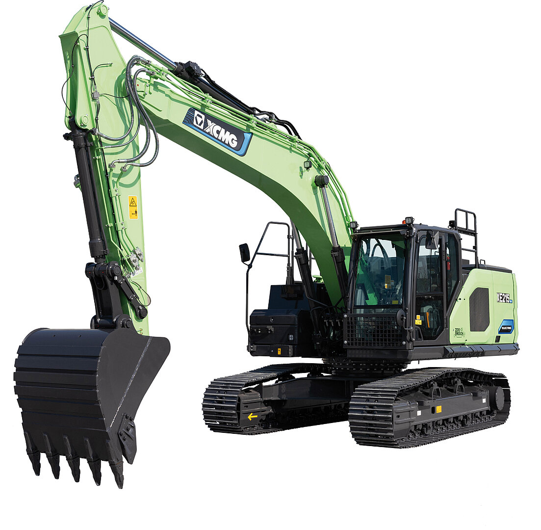 Im Rahmen des Testdrive-Events blieb es aber längst nicht nur bei Radladern. Ausgiebig testen durfte das bauMAGAZIN auch die elektrisch betriebenen Kettenbagger – darunter den »XE215-EV«, einen 23-Tonner, der mit 140 kW Leistung und einer Grabkraft von 149 kN auf das Demogelände fuhr. Verbaut ist eine Lithium-Eisenphosphat-Batterie mit einer Kapazität von 422 kW/h, die Schnellladezeit gibt XCMG mit rund 1,5 Stunden an. Das verbaute Hydraulik-Hauptsystem bringt eine maximale Durchflussrate von 2 x 216 l/min mit sich. Die maximale Reichweite des Baggers liegt bei 9 940 mm – die Grabkraft am Löffel kommt auf 149 kN. Zu den Abmessungen: Mit einer Länge von 9 675 mm, einer Breite von 2 990 mm sowie einer Höhe von 3 145 mm kann der E-Bagger sicherlich vielseitig eingesetzt werden. Laut XCMG reicht das Einsatzspektrum vom städtischen Bau über Gewinnung und Materialumschlag bis zum Tunnelbau. Im Mittelpunkt stehen bei diesem Bagger laut Hersteller vor allem Leistung, Null-Emissionen, gute Handhabung und Langlebigkeit. Fakt ist, dass sich der E-Bagger alles in allem »gut anfühlt«: Er wirkt kraftvoll, leise sowie flexibel und kann aus Sicht der Redaktion mit kameraunterstützter Übersicht, Wartungsfreundlichkeit und Stabilität punkten. Die Strukturkonstruktion wurde laut XCMG verstärkt, hinzu kommen eine automatische Schmierung sowie die Unterstützung mehrerer Anbaugerätemodi.