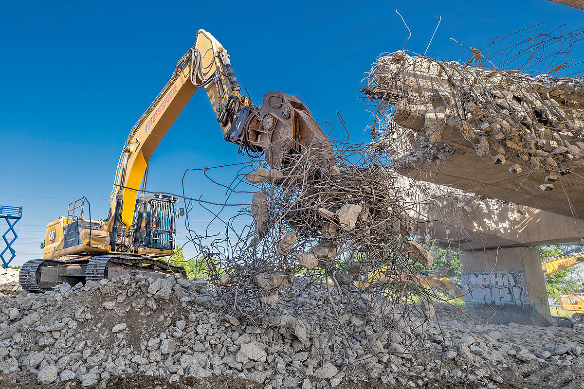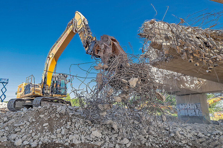 Mit Fortschritt des Abbruchs wurde mehrfach die Position der Pontonanlage versetzt – Bagger sollten sich auf den Pontons möglichst wenig bewegen. Deswegen wurden die Anbaugeräte durchgereicht. Als die Arbeiten im vollen Gange waren, hatte jede Maschine ihr Besteck vor sich und konnte dann auf das passende Equipment zugreifen. Schwimmwesten für die Maschinisten und Rettungsringe waren bei diesen Rückbauarbeiten obligatorisch und vervollständigten die persönliche Schutzausrüstung. Begleitet wurden die Arbeiten von Rettungsbooten, um maximale Sicherheit zu gewährleisten. Damit kein noch so kleiner Krümel an Bauschutt im Wasser landete, wurden sämtliche Zwischenräume mit unzähligen Stahlmatten und Baggermatratzen mithilfe des »Cat M322« ausgelegt – somit war die Arbeitsfläche großvolumig ausgekleidet worden. Eine weitere Vorsichtsmaßnahme: die Brücke möglichst kleinstückig abzubrechen. Umgekehrt verhielt es sich beim Bewehrungsstahl, der wiederum sehr lang gelassen wurde, um das Risiko, dass Teile ins Wasser fallen, zu reduzieren. »Lag eine gewisse Menge an Abbruchmaterial auf der Fläche, abzulesen am Freibord, dem Abstand zwischen Wasserspiegel und Kante des Pontons, musste alles mithilfe von Greifern gelöscht werden«, so Jens Uhlendorf. An Land stand dafür bereits ein Cat-Radlader »966« einsatzbereit, um das Material in Empfang zu nehmen und am Ufer zu verfahren.