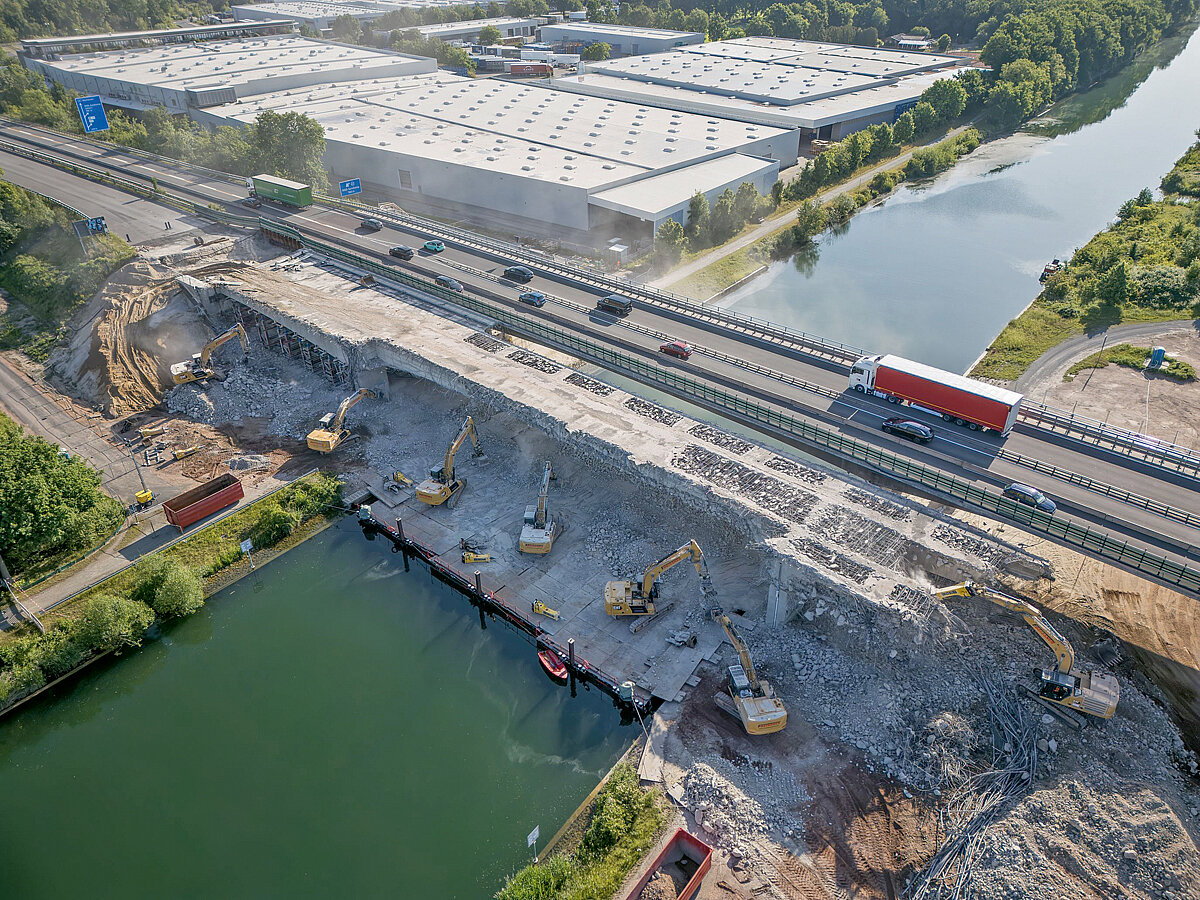 Beim Rückbau der Wo2-Brücke setzte sich die Anlage aus drei Pontons zusammen, die aus 32 Einzelpontons gebildet wurden. Im Hafen von Wolfsburg erfolgte der Zusammenbau, und zwar drei Wochen, bevor die Baumaschinen loslegten. Das ging nicht ohne intensive Vorbereitungen im Vorfeld über die Bühne. Denn trotz der vollständigen Sperrung des Mittellandkanals unterlag man den Regeln der Binnenschifffahrt. Das heißt, Mitarbeiter mussten die entsprechenden Qualifikationen für die Anlage vorweisen, die sie bereits lange im Vorfeld erworben hatten. Per Schubbooten wurden die Pontons dann zum 2 km entfernten Einsatzort gebracht. Dort angelangt, wurden sie erst nebeneinander befestigt. Damit wurde dann der komplette Kanal überspannt. Weil sich so eine Fläche nicht ohne Weiteres einfach parken lässt, wurden dann die Pontons erst kurz vorher in Position unter das Bauwerk geschoben. Verzurrt wurden die Pontons am Ufer bzw. Pfähle übernahmen die horizontale Befestigung im Wasser. Per Rampe gelangten dann die Cat-Baumaschinen auf die schwimmende Plattform mit knapp 1 000 t Tragkraft. Somit konnten sie in Tag- und Nachtschicht ihr Werk verrichten.