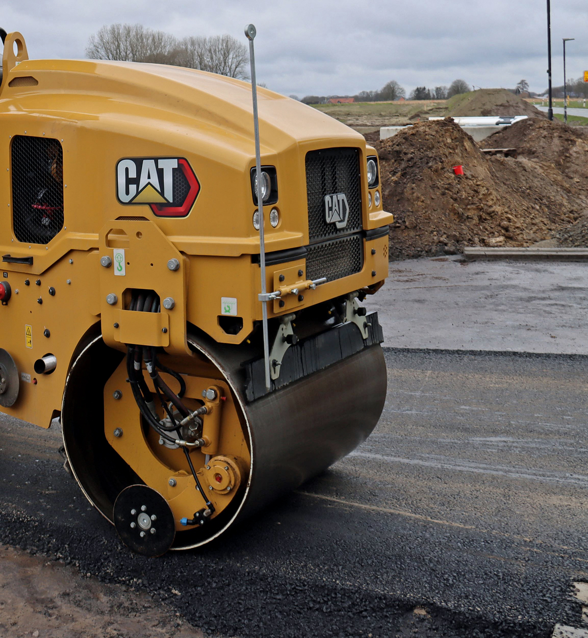 Zum Fuhrpark gehört unter anderem eine Tandemwalze vom Typ Cat 2.5 GC mit Pendelgelenk. Aufgrund ihrer ein Meter breiten Bandage ist die Walze kompakt und wendig, was sich etwa bei Übergängen bewährt. Mit 50 bzw. 62 Hz wirkt die Verdichtungsleistung der Glattmantelbandage auf den zu verdichtenden Asphalt ein. Die kompakte Walze verfügt über ein 400 kg schweres Ballastpaket. Somit erreicht sie vorne eine statische Linienlast von 11,85 kg/cm und hinten von 13,36 kg/cm, was der flächenmäßigen »statischen« Verdichtung durch die Bandage zugutekommt. Durch den verschiebbaren Komfortsitz kann der Fahrer die Verdichtungsleistung im Blick behalten, Übergänge kontrollieren und auf Anschlüsse wie Fugen- und Nahtausbildungen achten, um diese fest anzudrücken. Die Asphaltkanten werden mit der Andruckrolle verdichtet. Bei einer Randeinfassung kommt die Schneidscheibe zum Einsatz. Für Griffigkeit der Asphaltdeckschicht sorgt im Anschluss der Splitt, der per Streuer auf den heißen Asphalt eingewalzt wird. »In dieser Kombination können wir mit unserer Maschine mehrere Arbeitsabläufe ausführen und daher die Cat Walze flexibel einsetzen. Das schätzen wiederum auch unsere Mietkunden«, so Burkhard Stüve.j