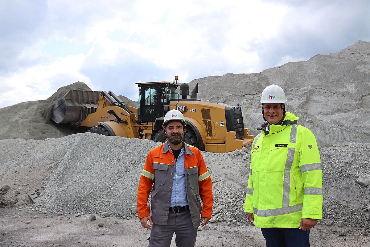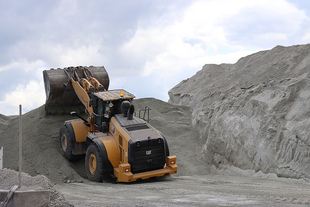 Glühend heiße Schlacke wird erst aus Kübeln in Schlacke-Beete ausgekippt. Dann muss die Schlacke auf Temperaturen von bis zu 300 Grad Celsius abkühlen, bis sie im übertragenen Sinn wieder angefasst werden kann. Dann kommt ein Cat Radlader 988 ins Spiel, der die Schlacke-Beete reinigt und ausfährt. Aber das ist nur ein Betätigungsfeld von HRV. Das andere: die Aufbereitungsanlage zu beschicken und das Fertigmaterial aufzuhalden – das ist wiederum Sache vom Cat 982, der das Material aufnimmt und abfährt.