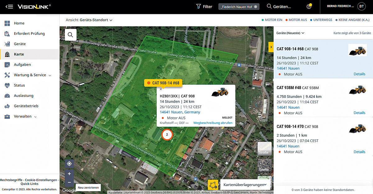 Mithilfe der neuen VisionLink-App, welche die bisherige App ersetzt, hat er für das Management der Flotte eine neue Oberfläche sowie Benutzerführung erhalten, damit er die Daten der Maschinen möglichst schnell und einheitlich im Blick hat. Mit der App ist er immer auf dem neuesten Stand bezüglich der Cat Flotte und hat auch von unterwegs Zugriff auf die Maschinendaten.Dabei interessiert ihn vor allem eines: der Standort. Denn immer wieder war das Unternehmen in der Vergangenheit mit Diebstahl konfrontiert. Bis nach Polen wurde gar ein Cat Minibagger außer Landes geschafft. »Diebe hatten früher leichtes Spiel und sind auf Baustellen eingebrochen, um dann Kleingeräte zu entwenden oder Diesel zu stehlen. Es häuften sich die Vandalismusschäden, wenn Tankdeckel aufgebrochen wurden. Da musste man ein paar Tausend Euro abschreiben. Im schlimmsten Fall stand das Gerät, bis es wieder repariert war«, erklärt Bernd Fiedrich, der dem Diebstahl einen Riegel vorschieben wollte.