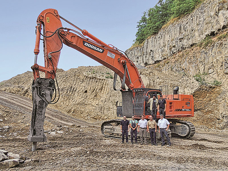 Ausgestattet mit einem 7-t-Hydraulikabbruchhammer, läuft der DX700LC in der Hochsaison und bei der Vormaterialherstellung täglich bis zu 20 Stunden im Steinbruch. Um den Fahrer und die an der Maschine verbauten Zylinder vor herabfallendem Gestein zu schützen, wurden ein zweifach gefertigtes Kabinenschutzgitter sowie Gummi-Schutzabdeckungen an dem Koloss montiert. Nach rund 500 Betriebsstunden mit dem DX700LC zieht Krings ein durchweg positives Fazit: »Die Maschine läuft in der Grube Mendig absolut zuverlässig und problemlos. Wir konnten die Quantität der abgebauten Mengen mit ihr deutlich steigern. Auch kommt der geringe Kraftstoffverbrauch der Maschine unserem Unternehmen zusätzlich zugute. Und darüber hinaus haben wir bei unerwarteten Hochphasen jederzeit die Chance, unseren Fuhrpark flexibel um große Radlader, Bagger oder Muldenkipper aus dem Mietpark von Bobcat Koblenz aufzustocken.«