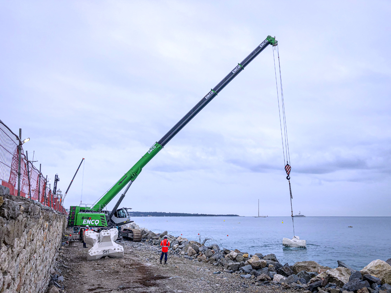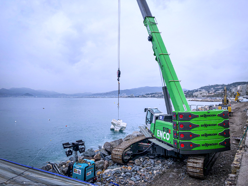 Die derzeitige Schutzmauer (bestehend aus Natursteinschüttung) wird durch eine Schutzmauer aus Kunstbetonsteinen ersetzt, genauer durch in Cannes la Bocca gefertigte 4 m³ Schutzelemente, sog. Accropoden. Der SENNEBOGEN 6113 E, über ENCO an das Projekt vermietet, verhebt und positioniert die Betonblöcke unter Wasser. Zwei Hauptgründe, sich für den 120 t Raupentelekran von SENNEBOGEN zu entscheiden: seine präzise und feinfühlige Steuerung, um die Blöcke sicher in der Nähe der Taucher und bei ständiger Meeresströmung zu positionieren. Außerdem kann der Kran selbstständig verfahren und sich von der ungeschützten Seeseite entfernen, wenn sich das Wetter kurzfristig ändert und sich die Wellen gerade in den Wintermonaten hoch auftürmen. Mit 120 t Traglast ist der leistungsstarke Teleskopkran SENNEBOGEN 6113 E der ideale Helfer für Kunden aus der Bauwirtschaft und der Kranvermietung. Besonders beim Heben, Verfahren und Positionieren von großen Lasten spielt er seine Vorzüge aus.