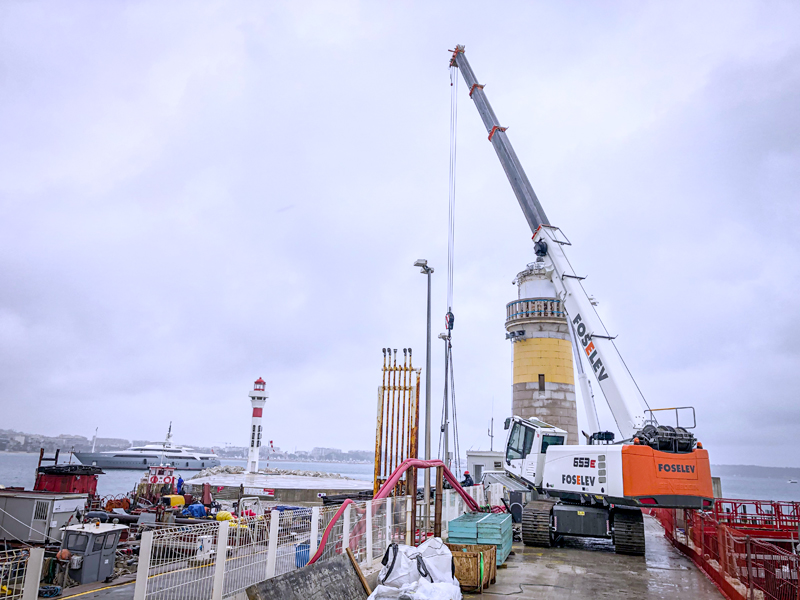 Im Hafen von Cannes werden seit 2018 Renovierungs- und Verstärkungsarbeiten an den Kaimauern von Laubeuf und du Large durchgeführt. Das Hauptziel dieses Großprojektes besteht darin, Mensch und Infrastruktur langfristig und im Einklang mit der Umwelt vor starken Wellengangbewegungen zu schützen. Dabei flexibel im Einsatz für Hebearbeiten sowie Pick & Carry Aufgaben: die SENNEBOGEN Raupentelekrane 653 E und 6113 E.