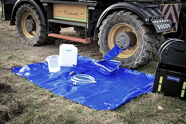 Die Aqua Evolution Systems GmbH entwickelt und vertreibt unter der Marke DERBLAUE® hochflexible Flüssigkeits-Auffangsysteme. Für den Bereich Baumaschinen sind besonders das Service-Set, der Flex-Trichter und die Unterlegwannen geeignet, die einen sauberen, einfachen und kontrollierten Umgang mit Ölen und Hydraulikflüssigkeiten ermöglichen. Aufgrund integrierter Biegemetallelemente können die Produkte des BLAUEN individuell angepasst werden und erleichtern so den Service besonders an schwer zugänglichen Engstellen.