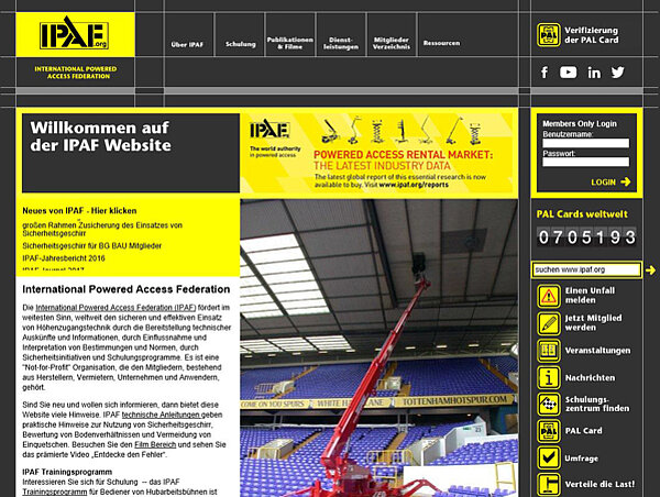 Die International Powered Access Federation (IPAF) fördert den sicheren und effektiven Einsatz von Höhenzugangstechnik weltweit. Seit ihrer Gründung im Jahr 1983 vertritt IPAF als eine "Not-for-Profit" Mitgliederorganisation die Interessen von Herstellern, Vermietern und Anwendern. Sie dient als ein Forum für alle aktiv Beteiligten im Bereich Arbeitsbühnen. IPAF spielte eine entscheidende Schlüsselrolle bei der Förderung zahlreicher Herstellungs-, Sicherheits- und Prüfverfahren, die sich mittlerweile als Standard in der Arbeitsbühnenbranche etabliert haben.